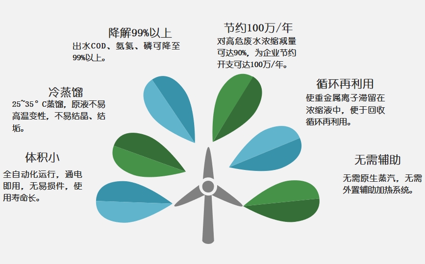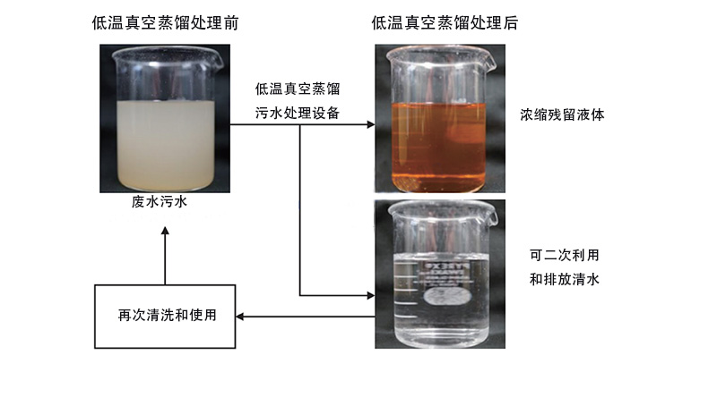 低温蒸发冷蒸馏技术可避免某些敏感性物质在高温下产生的不良副反应,整个蒸发过程不会产生结晶、结垢现象,浓缩率达75%~95%,蒸馏出水可回用。